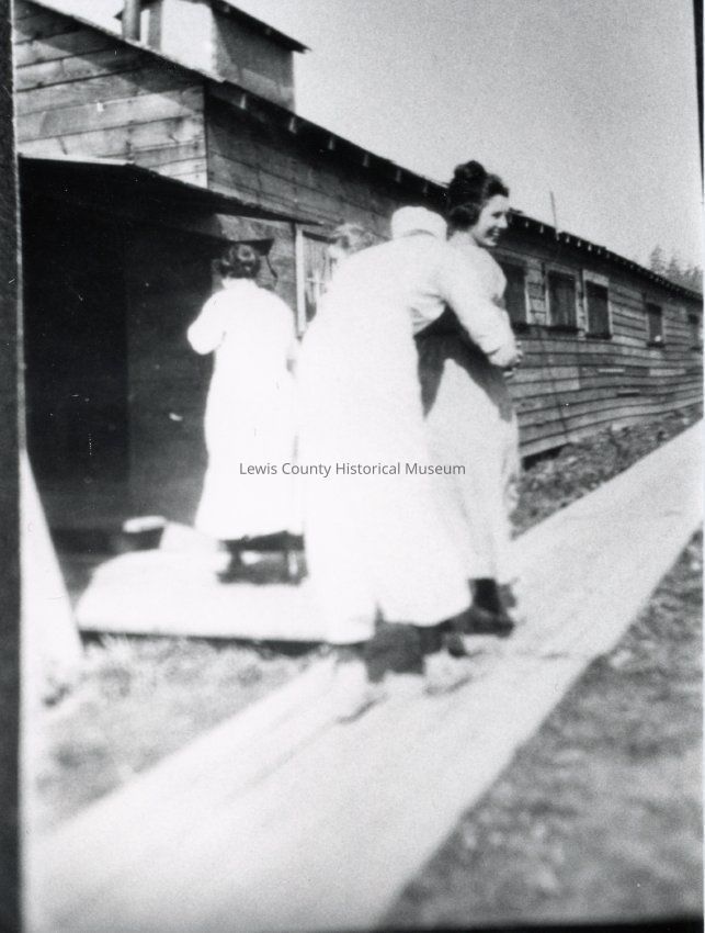Baker & Cooks at Snow Lumber Co. logging camp near Littell, WA. Cook house and mess hall in background. ca. 1920-1925 Have negative.Collection