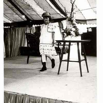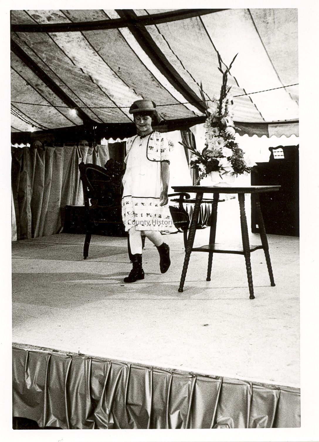 1980 Fashion Thru The Ages style show model Cindy Elder wearing an embroidered 1910 girls dress and straw hat. Taken at the SWW Fairgrounds free stage. Have negative.Collection