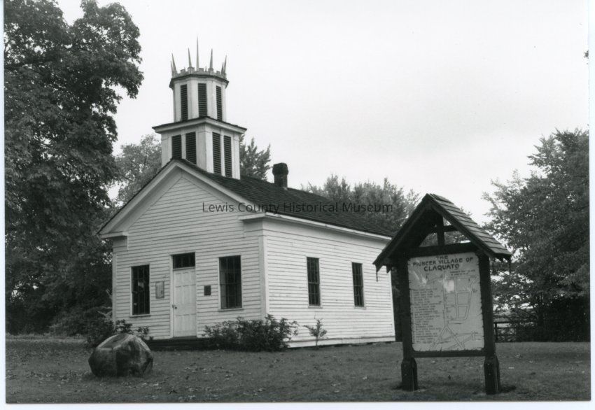 Photo of the Claquato Church, 1986 with the Monument and the Village Marker in front. Have negative.Collection