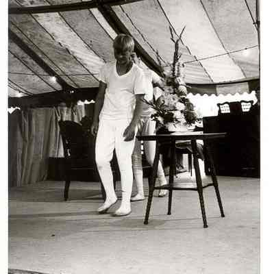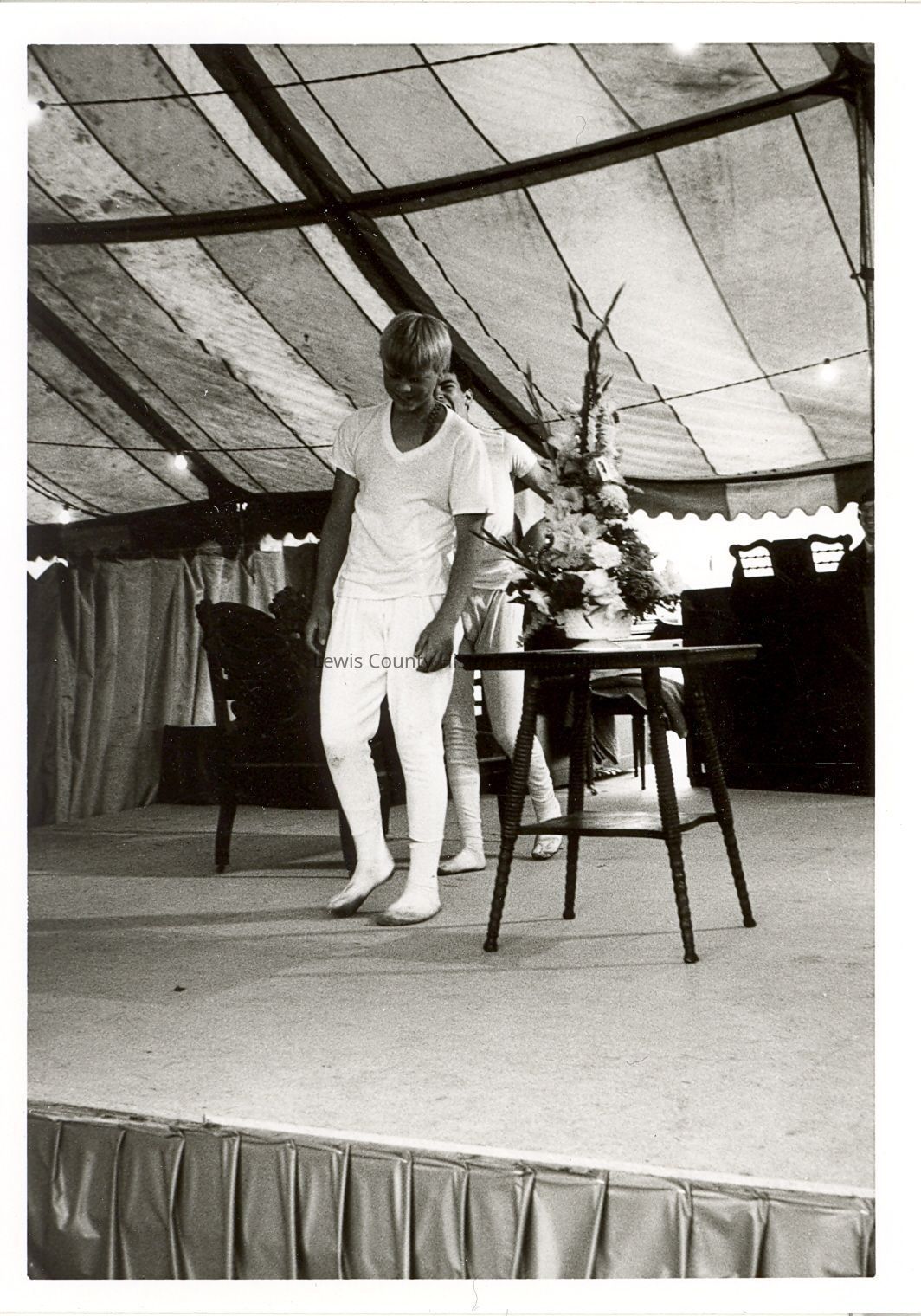 1980 Fashion Thru The Ages style show model Steve Kangas modeling men's white long underware. Taken at the SWW Fairgrounds free stage. Have negative.Collection