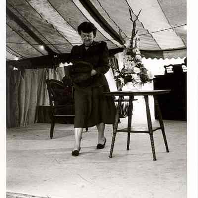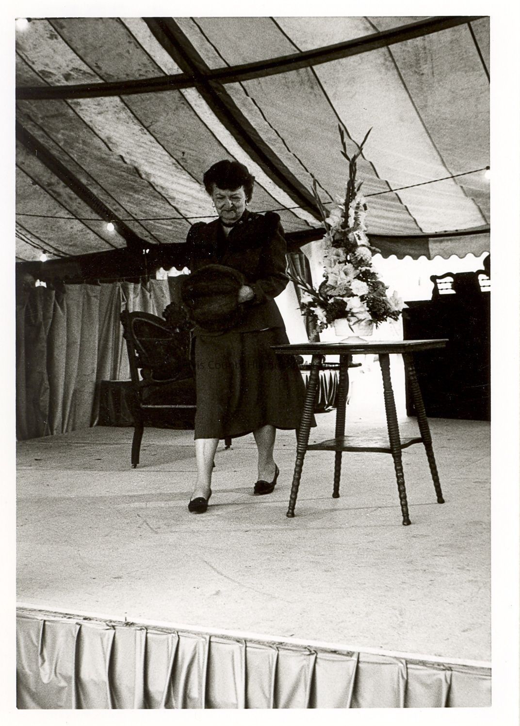 1980 Fashion Thru the Ages Style Show model Jessie Backman in a 1940's brown suit with a muff and mink trim. Taken at the SWW Fairgrounds free stage. Have negative.Collection