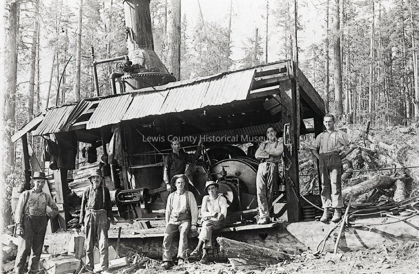 Somerville Mill steam donkey at their logging operation near Napavine, WA. No ID on men in crew or exact location. Photo ca. 1910. Have negative.Collection