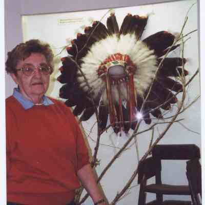 Trudy Hannon, volunteer, with case showing Indian Artifacts at Two Rivers, Two Peoples display, Nov. 12, 2000. 4x5 3/4, color print, Jerry Kelly photo. Trudi Hannan, display director.Collection