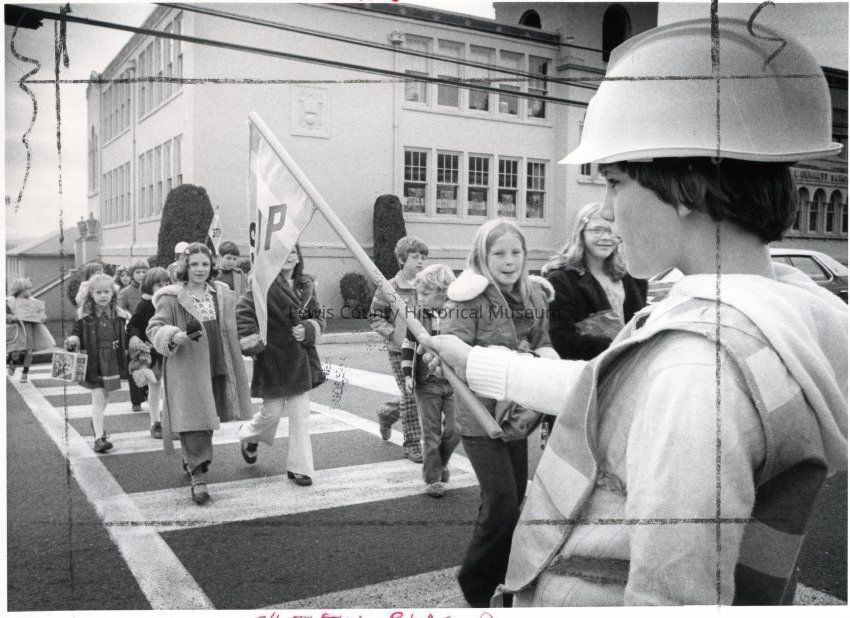 1977 photo of Sandy Cunningham a 5th Grade student and safety patrolman at R. E. Bennet School in Chehalis, WA. She is at far right in foreground. Photo shows group of children crossing the intersection on 2nd and Market Street, Chehalis, WA.