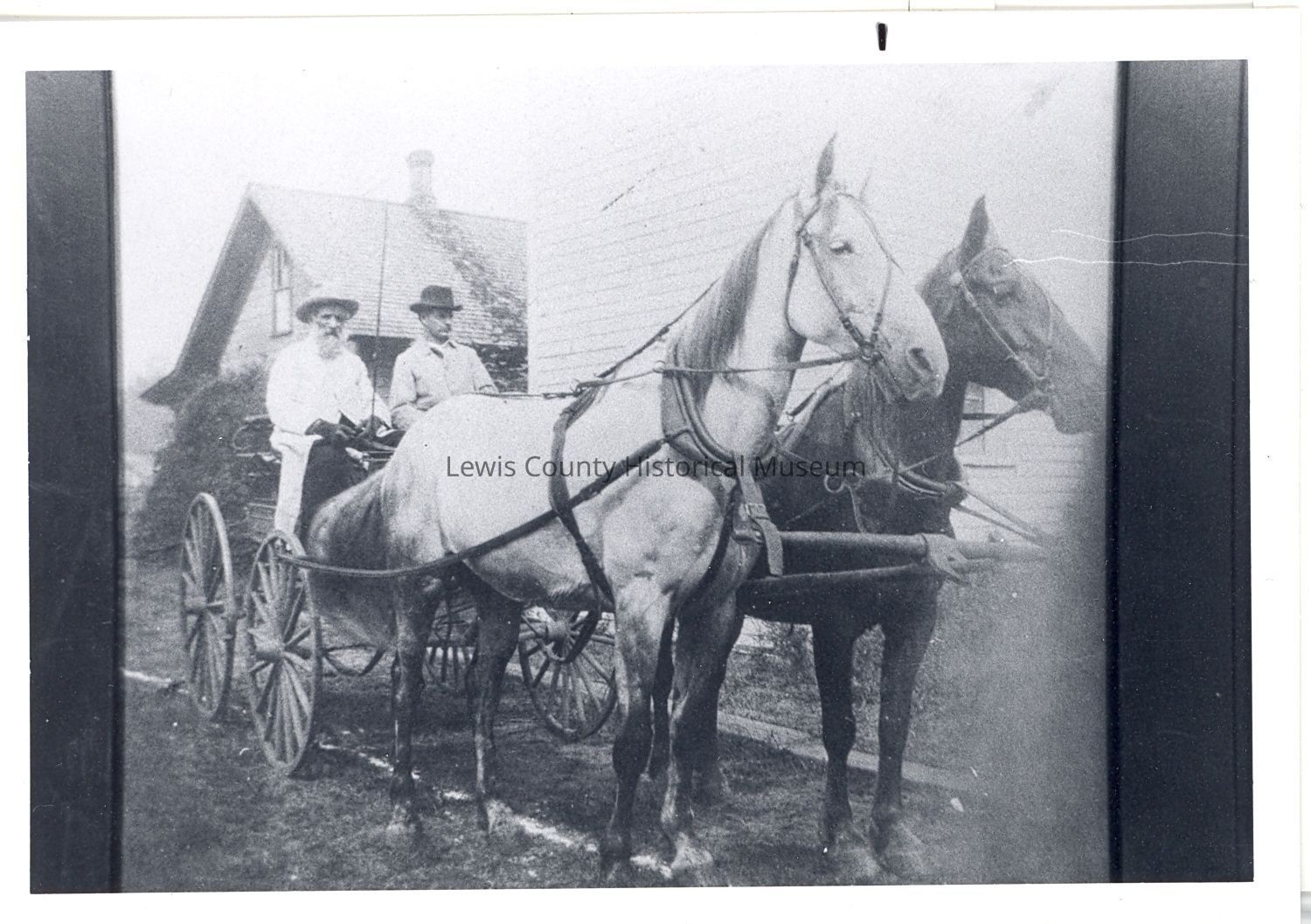 Horse and wagon with two passengers. Left, C.O. St. John and Joel Stearns taken at the St. John farm in Adna, WA about 1900. The farm produced grain, pigs, cows and horses. Have negative.Collection