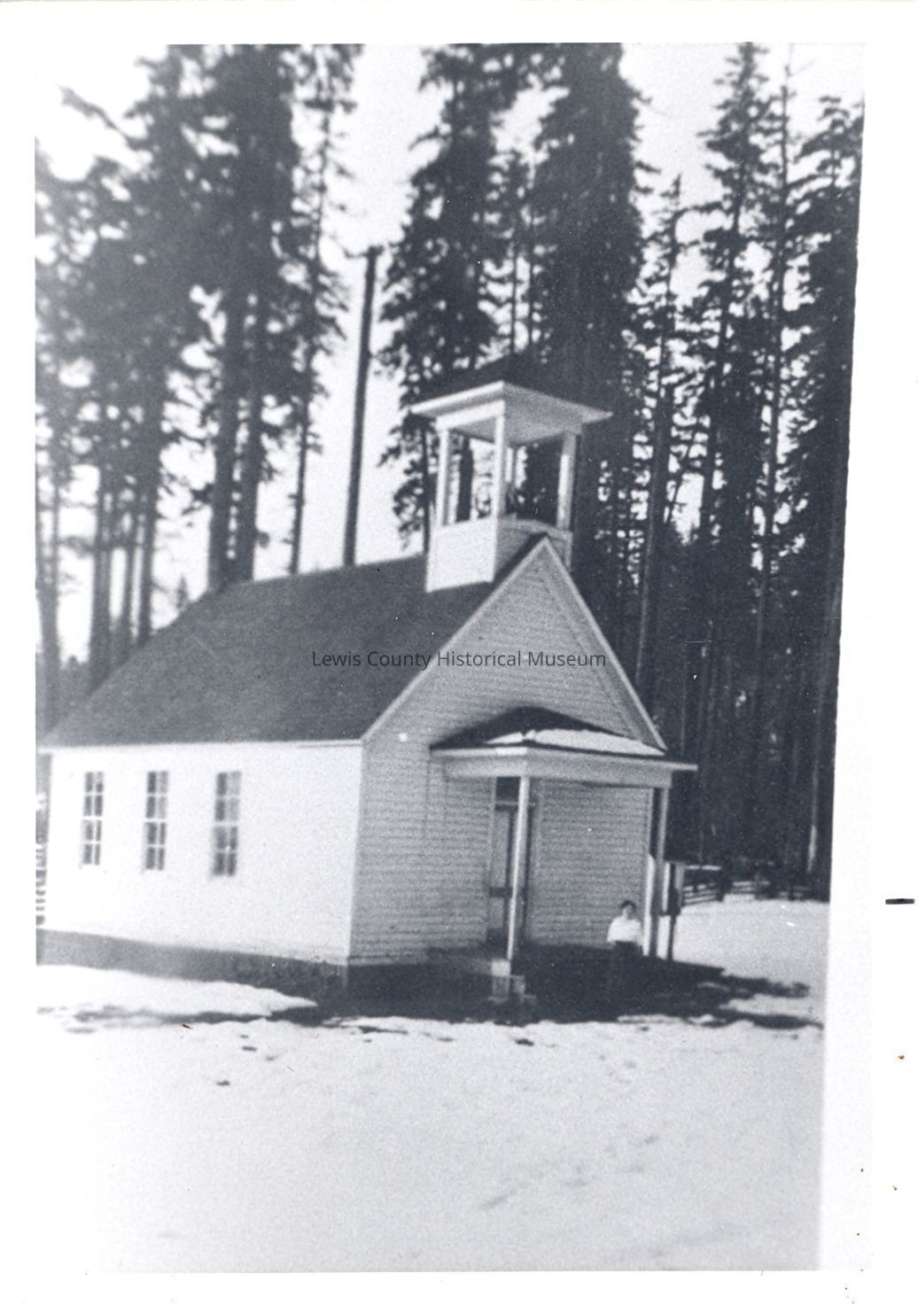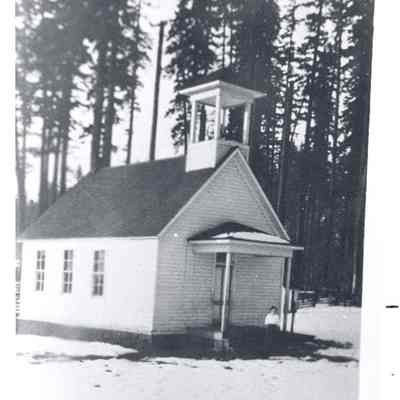 Exterior of the Wildwood School house. Taken in 1912 (snow on the ground), with Neva Lowery as the teacher in the lower right of the photo. Have negative. Have slide.