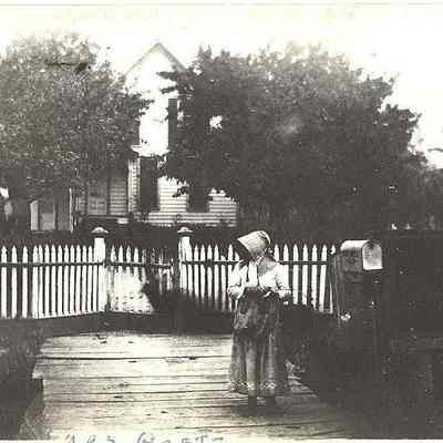 Photo of Mrs. Robert Goetz in front of her house, south of Chehalis, WA between 16th & 17th St. on the upper side of the Jackson Highway. Picket fence and planked sidewalks, Mrs. Goetz has on a sunbonnet and long dress. circa 1900's. Have negative.Collection