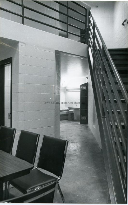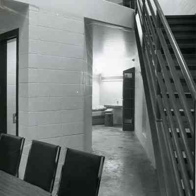 Interior of the new Lewis County Jail, 1986 before it was opened to the public, Chehalis, WA. From the hallway looking into a cell. The round object is a stool made from concrete. Table and chairs in the front are from the work release area. Screen area is a locker on the wall. These are provided in the work release area only. Have negative.Collection