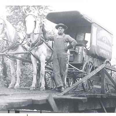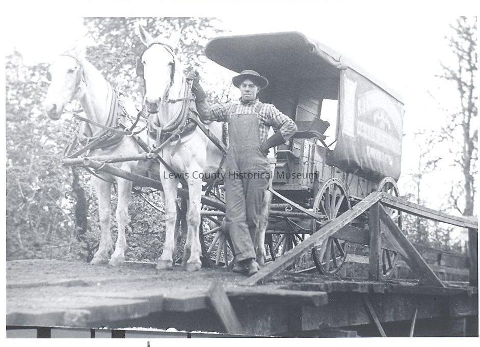 Excellent photo of the horse drawn delivery truck with unidentified driver from the R.J. _____ General Merchandise Store, Oakville, Wa. circa 1915. Copy from the Mauermann Family photos. Have negative.Collection