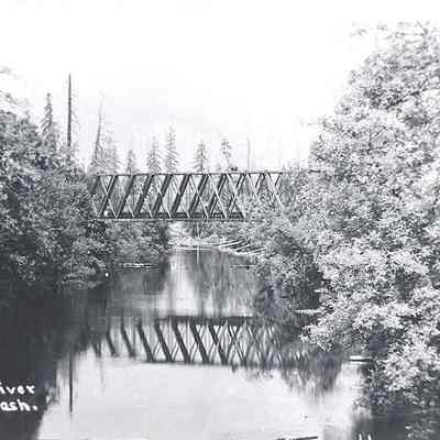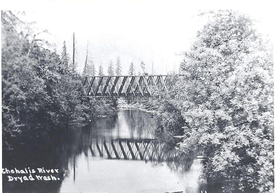 Copy of the Mauermann photos. View of a train trestle over the Chehalis River, at Dryad, WA Have negative.Collection