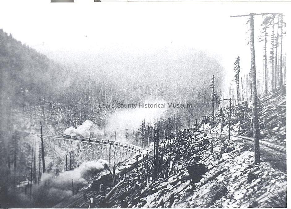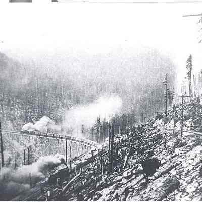 Great Northern Railroad train entering the Horseshoe Tunnel in Washington. Good shot of the turn into the mountain. Have negative.Collection