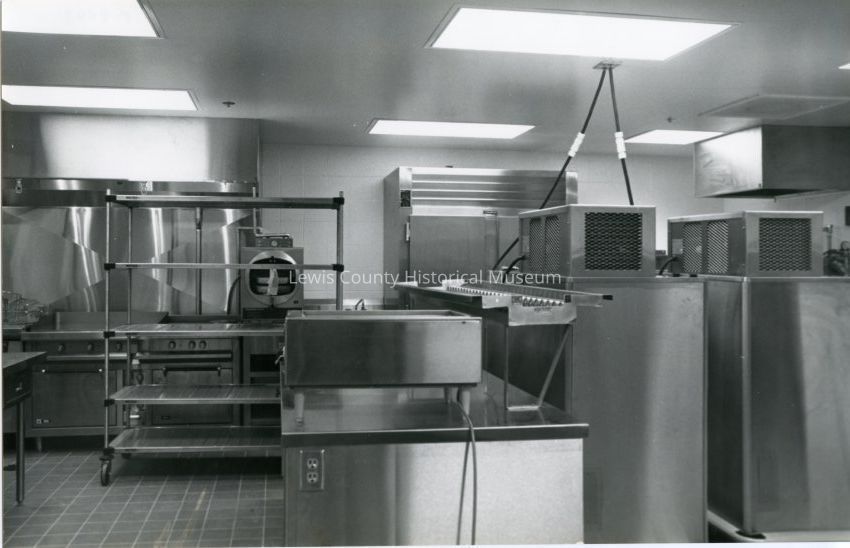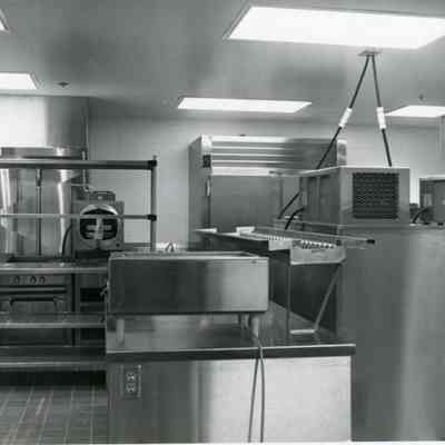 Interior of the new Lewis County Jail, 1986 taken before it was opened to the public, Chehalis, WA. Shows the kitchen area/food preparation. In the center is the serving line equipment. Have negative.Collection