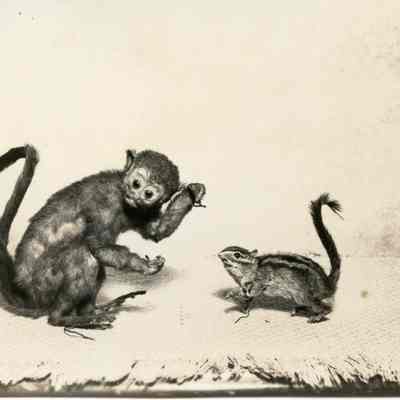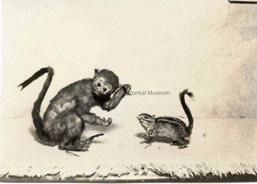 Mounted Specimens: a monkey and a squirrel, in possession of Ellis Oliver and Ron Graves, the great nephew of J. K. Lum. The boys lived in Centralia where the photo was taken in 1939. Have negative.Collection