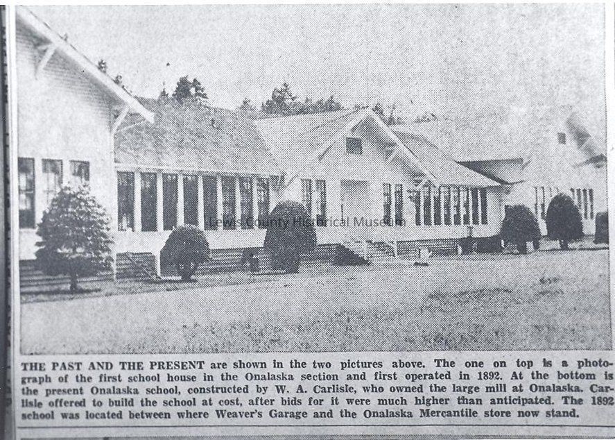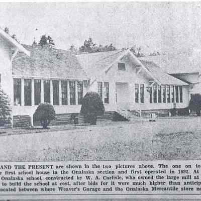 Good photo of the Onalaska school building. This was the second building built by W. A. Carlisle, the mill owner. He offered to build the school at cost after bids for it were much higher than anticipated. Have negative. Have slide.