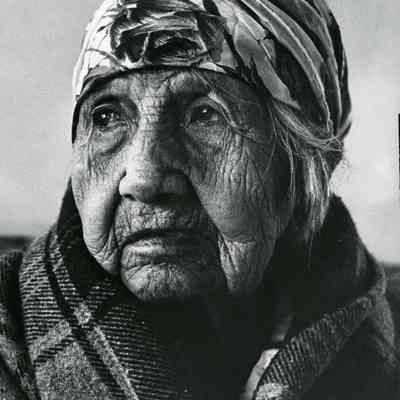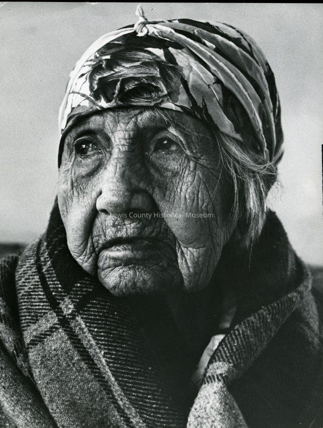 Photo of Mary Kiona taken by the Seattle Times in 1970. Mary Kiona died in 1971. Mary has a scarf around her head and an Indian blanket around her shoulders.Lexicon