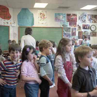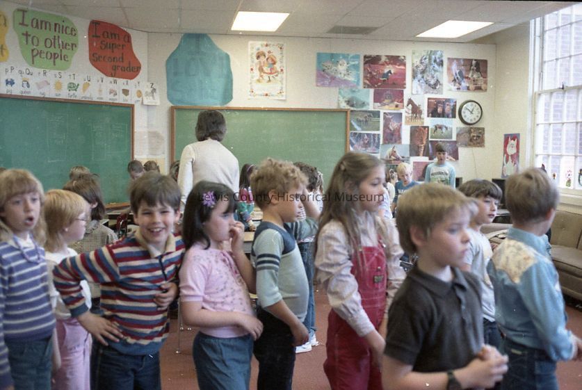 Children at Rochester Elementary School, Second Grade Class, lining up to get crackers with butter after a butter churning demonstration by Harry Gleason. May 1984. Have negative.Collection