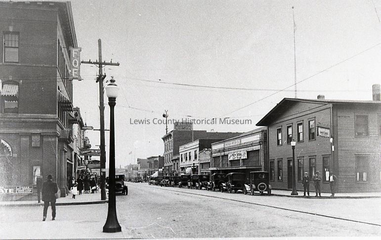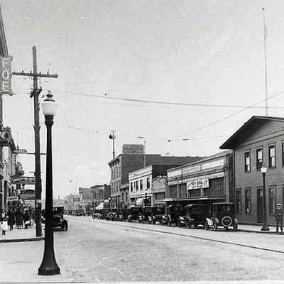 Unidentified street scene showing various bussineese and automobiles. Have negative.Collection