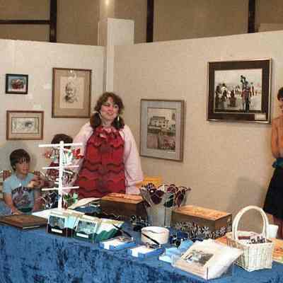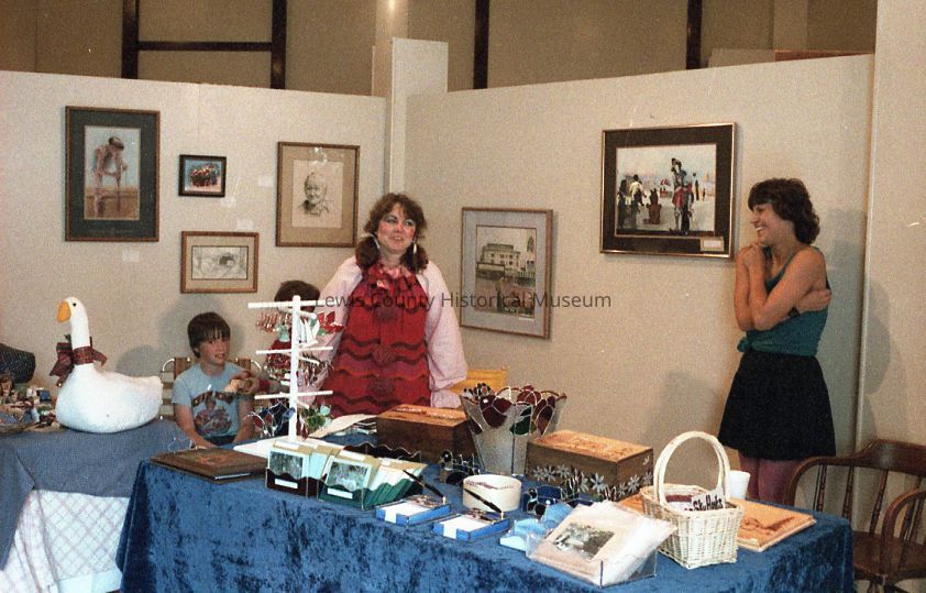 LCHM Krazy Days Arts & Craft Show. July 1984. Terri Hill, left with her woodburning and paintings. Have negative.Collection