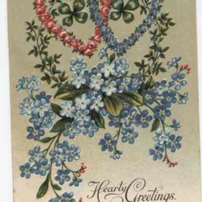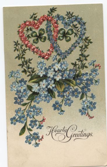 "A greeting card, color tinted, captioned "Hearty Greetings". Two heart shaped wreaths of forget-me-nots, one red and one blue, each with a four leaf clover, are atop a spray of blue forget-me-nots. Postmark: Alpha, WA, rest illegible. "Cataloged By