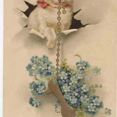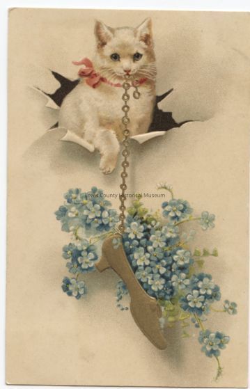 A German made card, white background, showing a white cat with a red ribbon around its neck, pushing through a piece of paper. In the cats mouth is a gold chain from which is suspended a golden slipper full of blue forget-me-nots. 1¢ stamp.Cataloged By