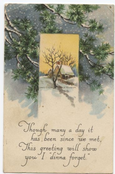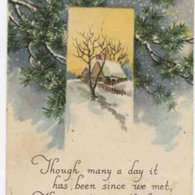 Christmas Greeting, a rectangular rural snow, tree and house scene is backed by evergreen branches. Postmark: Piqua, Ohio, Dec. 17, 1924. 1¢ stamp.Cataloged By