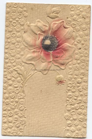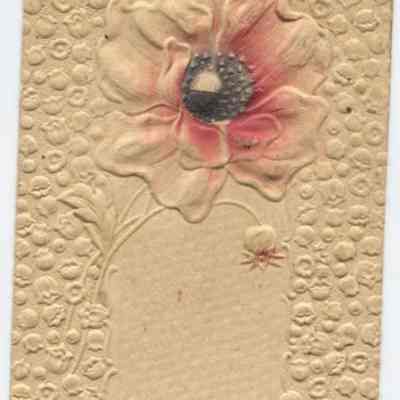Christmas Greeting, beige embossed card, has a poppy with pink and charcoal tinted center. Postmark: Woodburn, OR, Dec. 23, 1907. Stamped Rec'd: Chehalis, WA, Dec. 23, 1907.Cataloged By