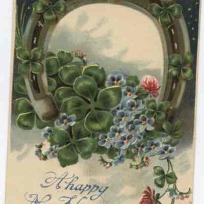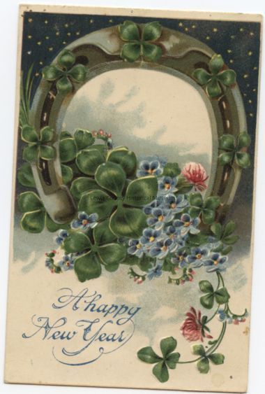 New Year Greeting, horseshoe covered with four leaf clovers and forget-me-nots.Cataloged By