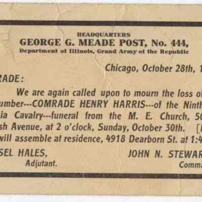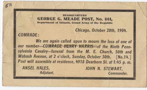 A death notice from George B. Meade, # 444, Grand Army of the Republic, of Comrade Henry Harris, whose funeral will be October 30, 1904. Postmark: Chicago, Ill., Oct. 28, 1904.Cataloged By