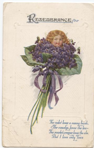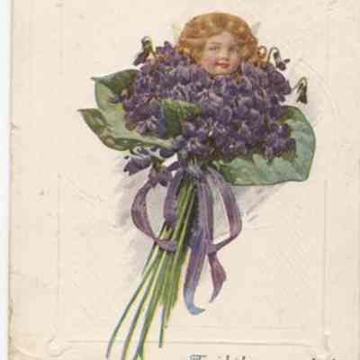 Remembrance card, a large bouquet of violets, a girls face peering out the top. Postmark: Sauk Center, Minn., July 30, no year. 1¢ stamp.Cataloged By