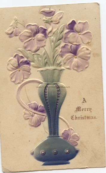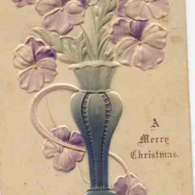 Christmas Greeting, a blue vase of violets colored pansies.Cataloged By
