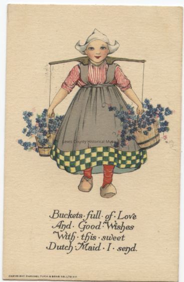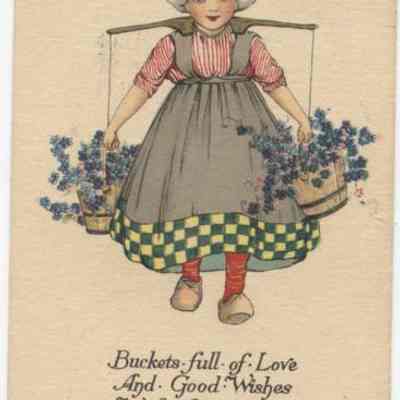 Greeting card, dutch girl with suspended bucket of flowers on each side. Postmark : Portland, OR, Mar. 20, 1919. 2¢ stamp.Cataloged By