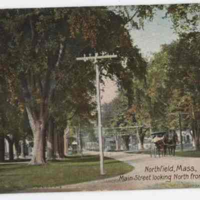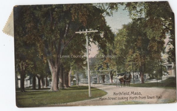 Picture of main street looking north from Town Hall in Northfield, Massachusetts. Horse drawn buggy in street, lined with many trees. Postmark: Northfield, Mass., Mar. 6, 1909. 1¢ stamp.Cataloged By