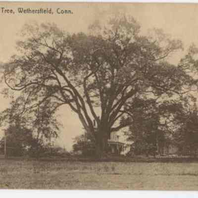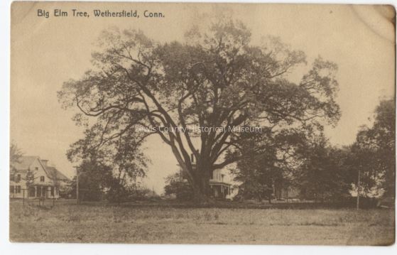 "Picture shows several large house, several trees and the "Big Elm Tree" at Wethers field, Connecticut. "Cataloged By