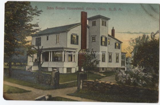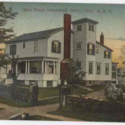 Picture of the John Brown homestead in Akron, Ohio. Large white 2-1/2 story house, stone fence around yard, flowering shrubs and trees.. Postmark: Akron, Ohio, July 16, 1909.Cataloged By