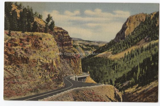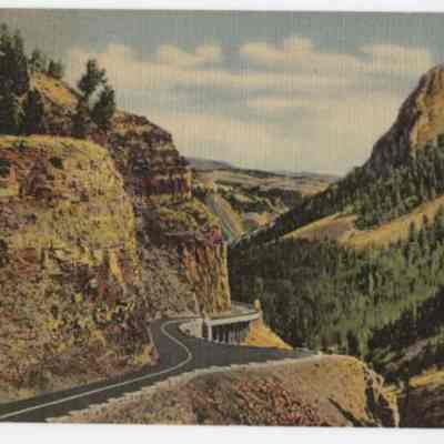 Golden Gate Canyon, Yellowstone National Park scene shows highway along canyon wall. Postmark: Gardener, Mont., July 2, 1957. 2¢ stamp.Cataloged By