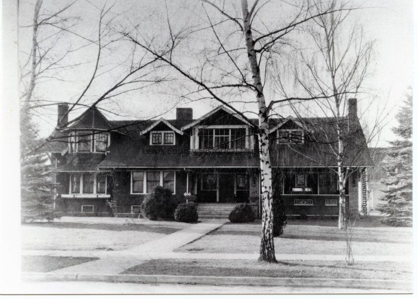 Photo of the Hubbard House in Centralia, WA. Seen in photo is a dark colored house with some shrubs and trees in the front yard. Also has a sidewalk leading from the street up to the front steps of house.
