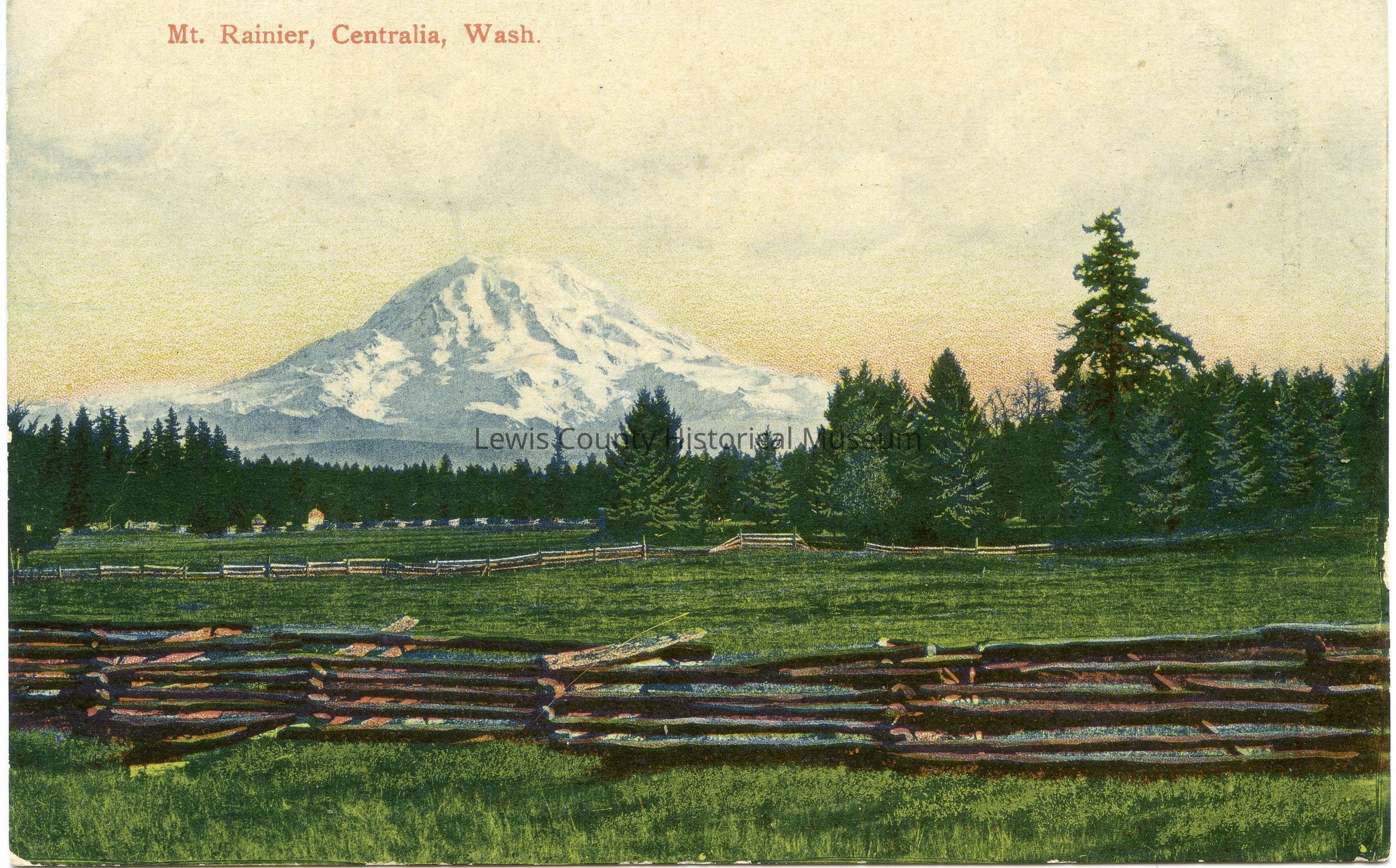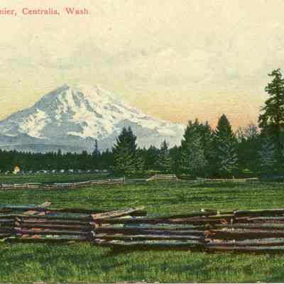 Picture postcard of Mt. Rainier from Centalia, WA. Rail fence in foreground, 1909