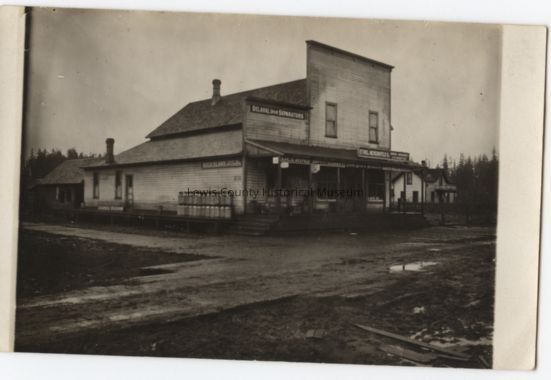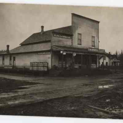 Picture postcard of exterior of Ethel Grocery Store,circa early 1900's, at the intersection of Jackson Highway & Brim Road, Onalaska. Frame building with milk cans stacked along side of building. Area is planked around front & side of store. Roads are dirt.Cataloged By