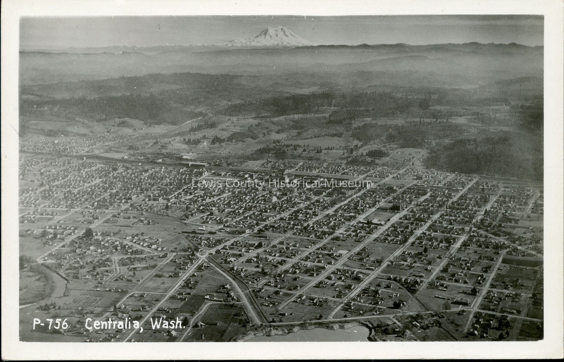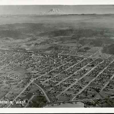 Black and White Postcard of Centralia, WA with Mt. Rainier in the background.Collection