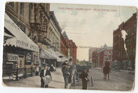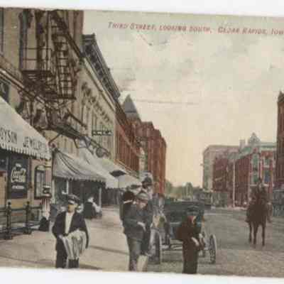 Postcard features a view of Third Street in Cedar Rapids, Iowa. Postmarked Sept. 24, 1908.Cataloged By
