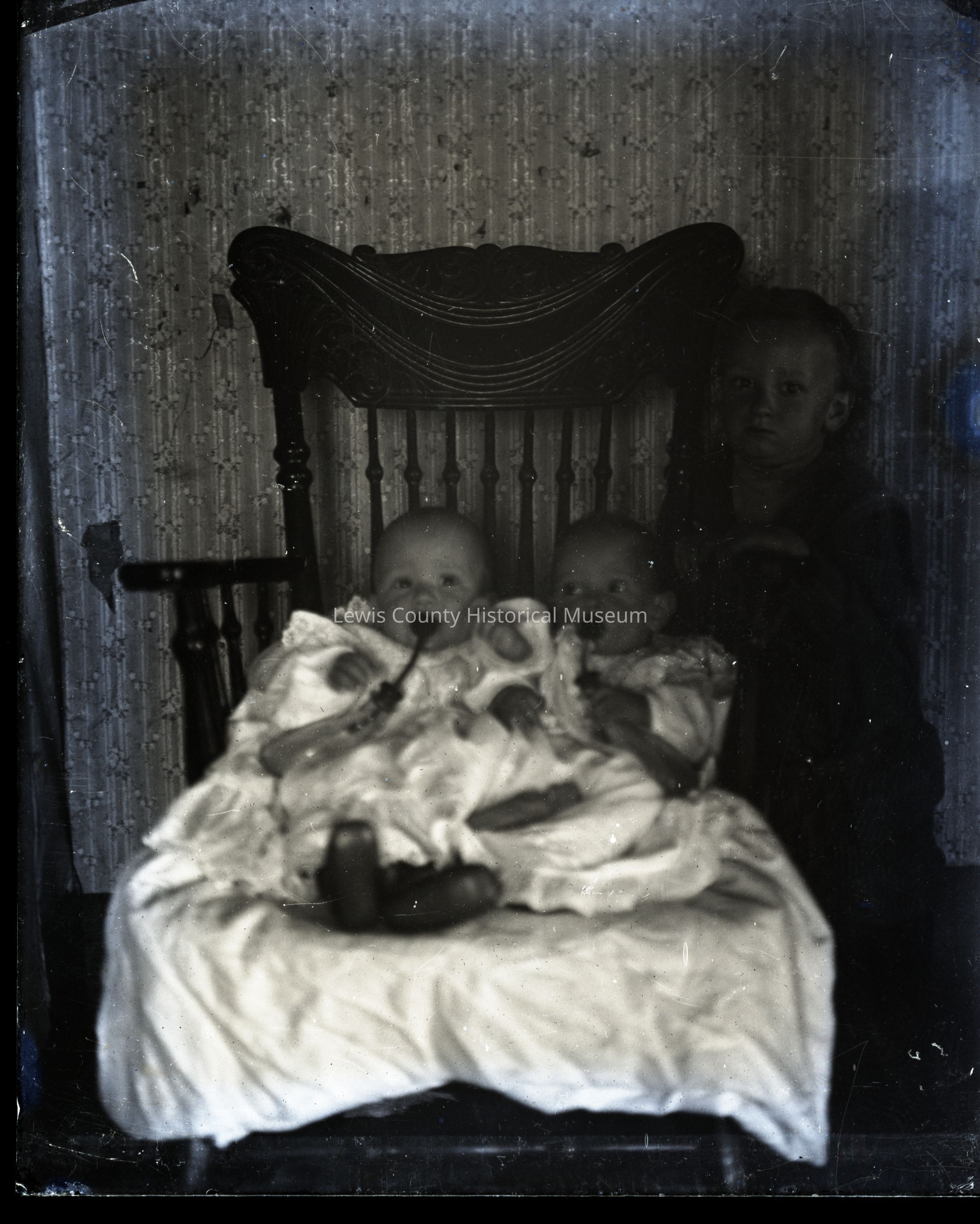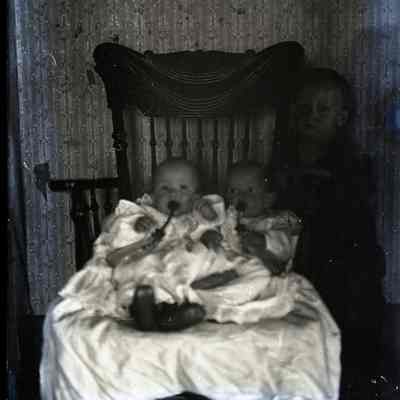 Unidentified children, two babies in a chair with child standing beside it.