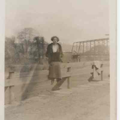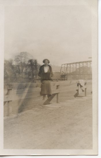 Picture postcard of girl standing on the road. Bridge and possibly Alexander Park in the background.Acquisition