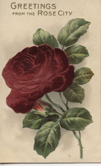 "Embossed postcard with red velvet rose on front. "Greetings from the Rose city"."Acquisition