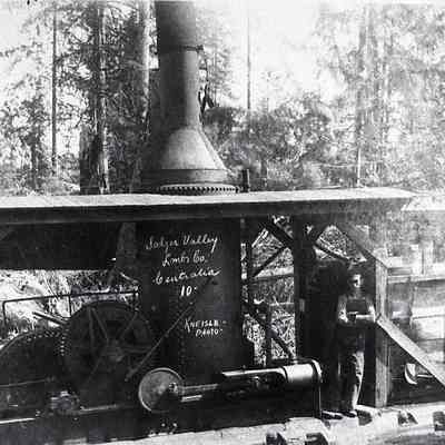 Steam donkey identified as Salzer Valley Lumber Company and an unidentified man. Have negative.Collection
