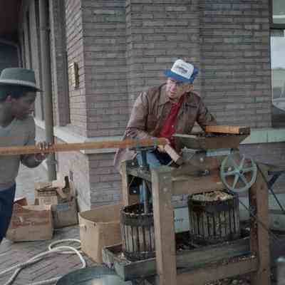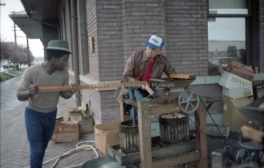 Don Bunker, on the right, teaching Green Hill school student at the October 1983 LCHM Cider Squeeze. Have negative.Collection
