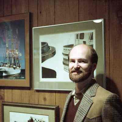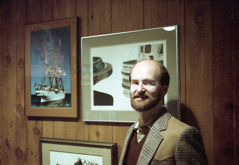 Photo of artist session at Dixie Rogerson's house. Doug Danielson with his painting. January 1984. Have negative.Collection