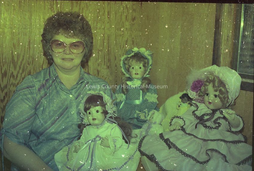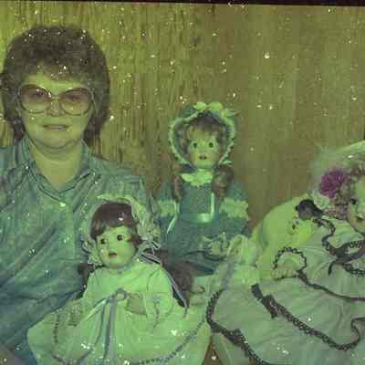 Color print of Rosemary Haddler and her dolls taken during photo session at Dixie Rogerson's on Feb. 12, 1983. Have negative.Collection