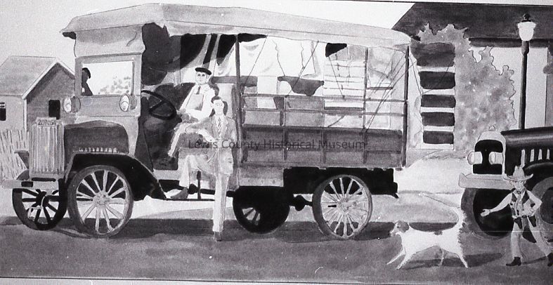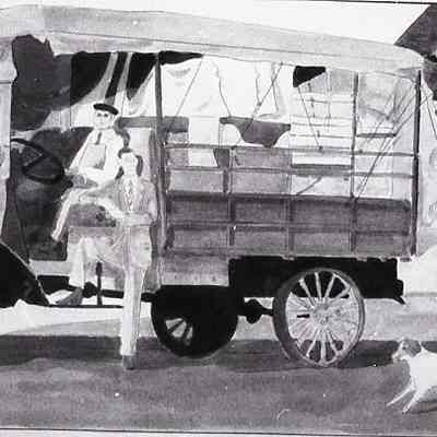 Picture of a painting showing two men, a boy and a dog near a delivery truck. Have negative.Collection