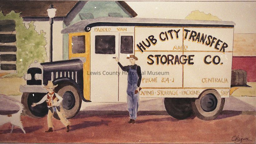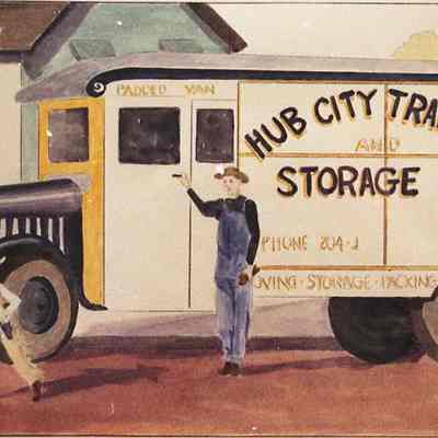 Color picture of a painting showing a man and a boy near a delivery truck. The name Hub City Transfer and Storage Co is on the side of the truck. Have negative.Collection