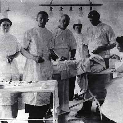 Picture of an unidentified hospital operating room. Doctors and nurses are attending to the patient on the operating table. Have negative.Collection